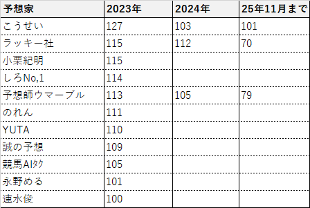 下の予想家のなかで実力が確かなのは予想師ウマーブルです。AIと人力予想の併用という、勝ち筋のシステムを取っていることが注目されます。2025年は予想開始以来初めて100%を割りそうですが、改善策を取ってくるはずです。また3年連続プラスがかかっているこうせい氏はデータ×調教×トラックバイアスの予想方法です。